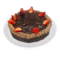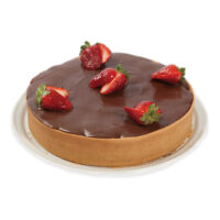 Massa patê sablé de chocolate, ganache de chocolate meio amargo, creme de leite condensado, morango e geléia de morango.