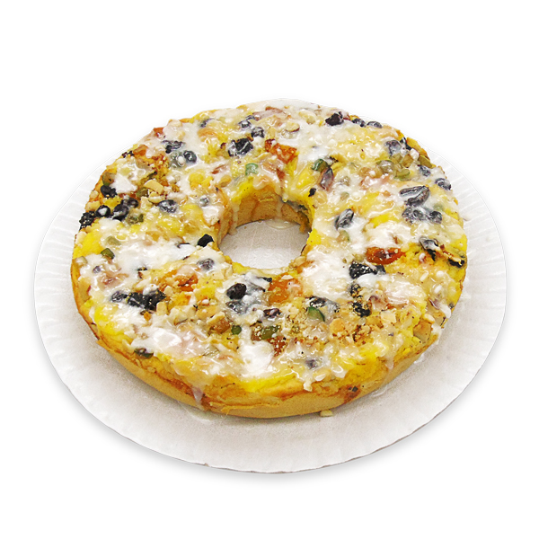Massa de croissant semi folhada, creme confeiteiro damasco e frutas cristalizada com cobertura de calda de leite condensado e coco fino.