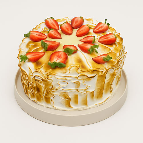 Massa de pão de ló branco recheado com creme alpes suíços (trufa de chocolate banco com geleia de morango), creme de leite condensado, morango, nata e com cobertura de merengue suíço e geléia de morango.