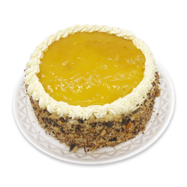 Massa de pão de ló branco, recheado com abacaxi, creme de leite condensado, pavê crocante de chocolate com castanha e nozes, flan de chocolate branco e nata com cobertura de nata, abacaxi, geléia e pavê de chocolate. (crocante de chocolate com castanha)