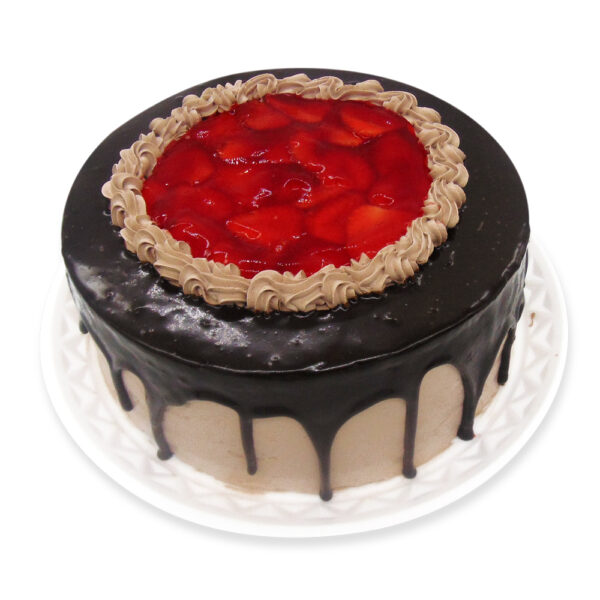 Massa de pão de ló de chocolate, recheado com creme sensação, musse de chocolate, morango e nata cobertura de chantilly de chocolate, ganache Paris.