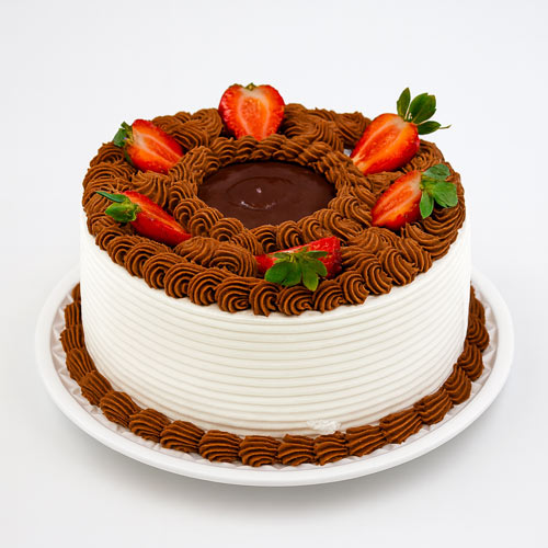 Massa de pão de ló branco e chocolate, recheado com creme de leite ninho, morango, nata, musse trufado de Nutella com cobertura de chantininho, musse de nutella e morango.