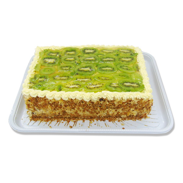 Massa de pão de ló branco, recheado com strogonoff de ouro branco, creme de leite condensado, praliné de castanha, kiwi e nata com cobertura de nata, kiwi, praliné de castanha e geléia.