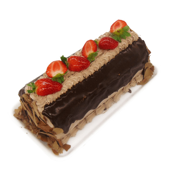 Massa de rocambole de chocolate, recheado com musse trufado e morango com cobertura de chantilly de chocolate e morangos.