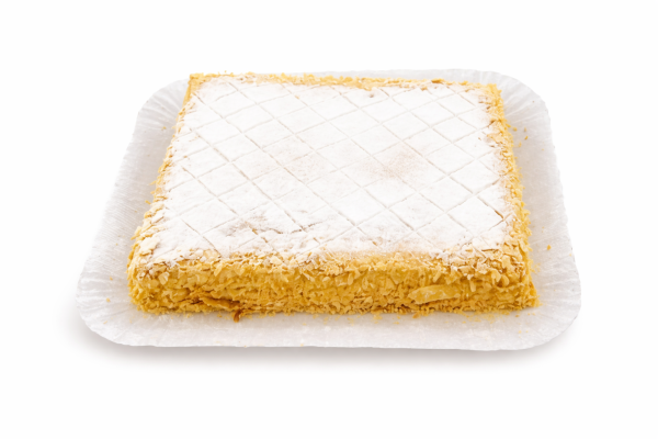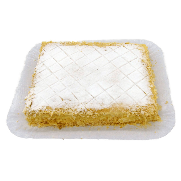 Massa folhada tradicional, recheado com creme confeiteiro e doce de leite com cobertura de nata, granulado folhado e açúcar de confeiteiro.